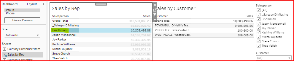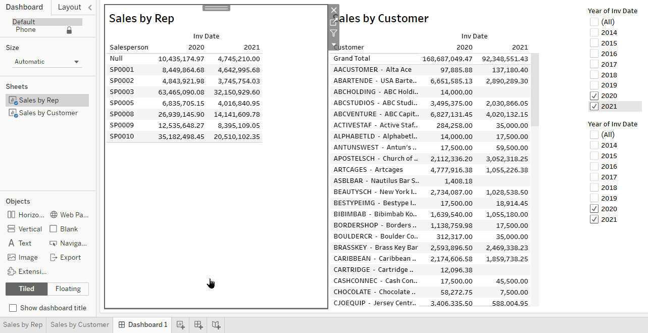 On the left panel, drag the Sales by Customer worksheet into the right of the dashboard area to insert it after the Sales by Rep.