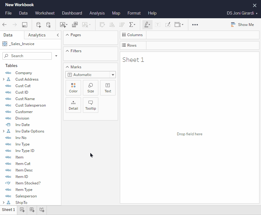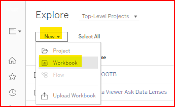 Click on the New Worksheet icon and create a new view from blank. Note you can create sheets, dashboards, and story tabs.