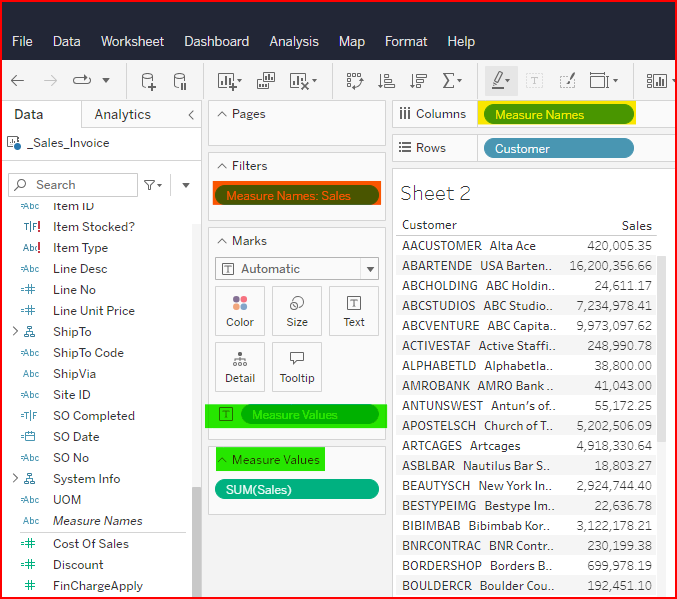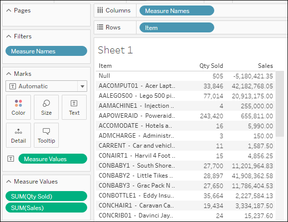 Notice that Tableau added a Measure Names field to the Columns section, Measure Names to the Filters section, Measure Values to the Marks section, and added a new section below the Marks called Measure Values.