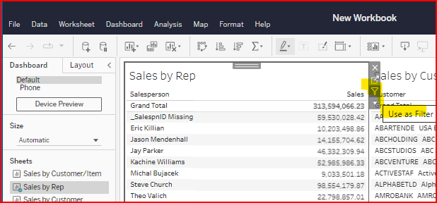 Add the Sales by Item worksheet to the dashboard and apply the action filter. Now you can filter by salesperson, customer, or item and see the interactions.