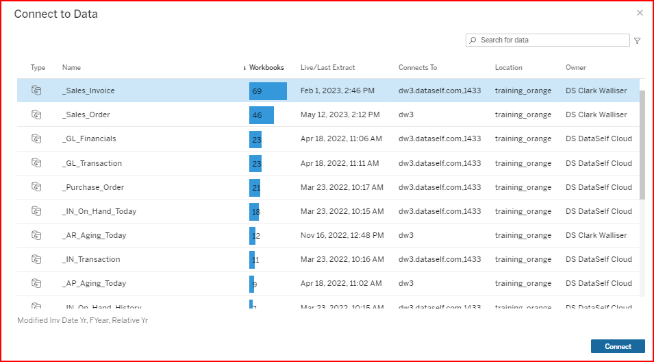Select a data source by either double clicking on it or clicking once to highlight the data source then clicking on the Connect button in the lower right. For this training, select _Sales_Invoice.