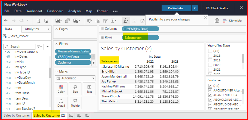 Verify your worksheets for Sales by Salesperson and Sales by Customer have filters set for the last two years.