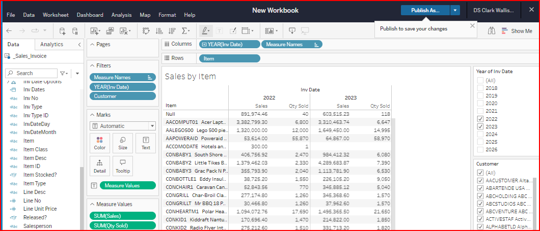 Activity 7: Create a new worksheet showing Sales by Customer, Invoice No, Invoice Date, and Item in the last 2 years.