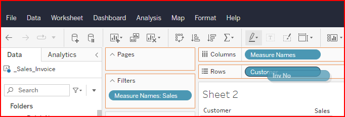 Create a new worksheet and insert Customer, Inv No, Inv Date and Item in the Rows.