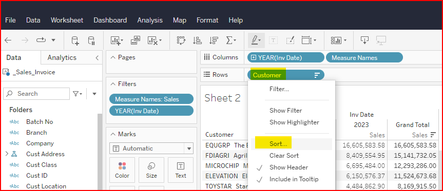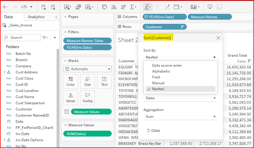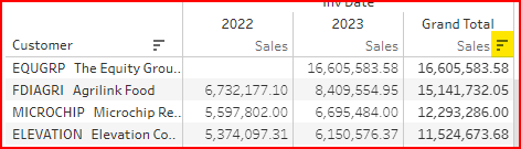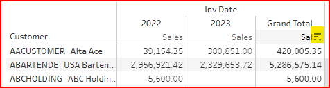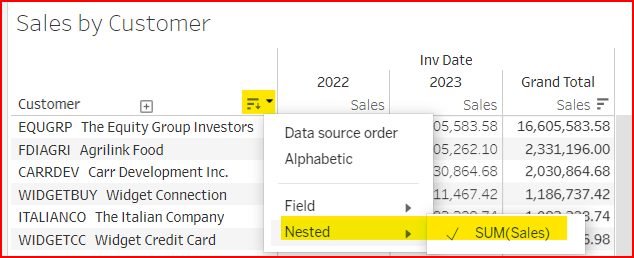 Note that the Sort Icon on the Customer heading shows a down arrow along with to descending icon. When you click on the arrow, you will see that the sort method is Nested. The nesting is based on the Grand Total of the sales per customer.