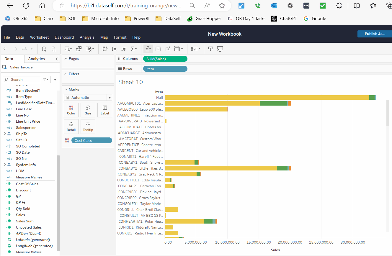 Customer Classfrom the data panel onto Columns. Notice that Tableau automatically moves theSalesmeasure to be the last field in the columns.The Bars are grouped per the 2nd dimension field,