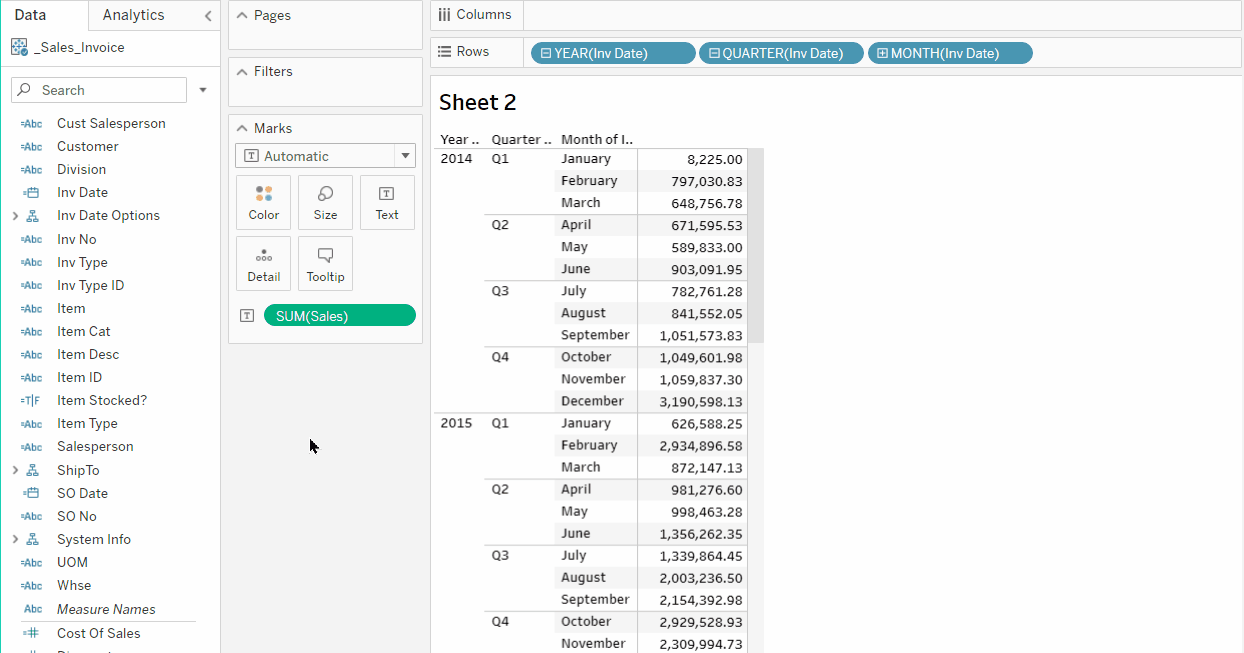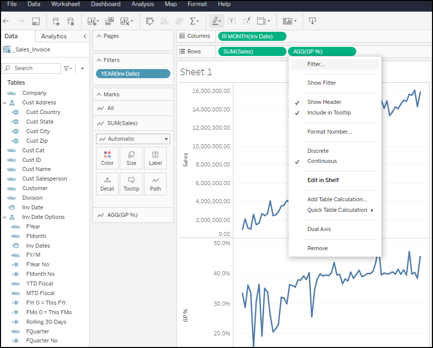Right-click the YEAR (Inv Date) blue field (discrete) in Columns, select the format, Month (May 2015).