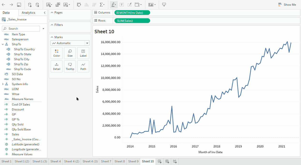 This changes the field to blue, (discrete). Now the trendline shows data by month regardless of the year.Drag Inv Date from the data panel and drop onto the Color mark (center panel).