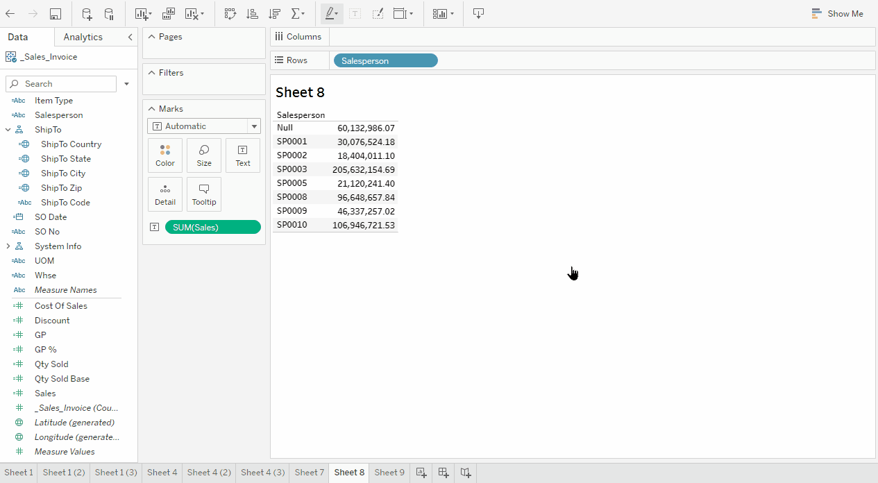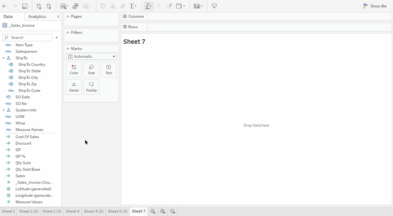 Drag a measure (Sales) to Columns, (don’t double click on the measure or drag it to the ABC section).