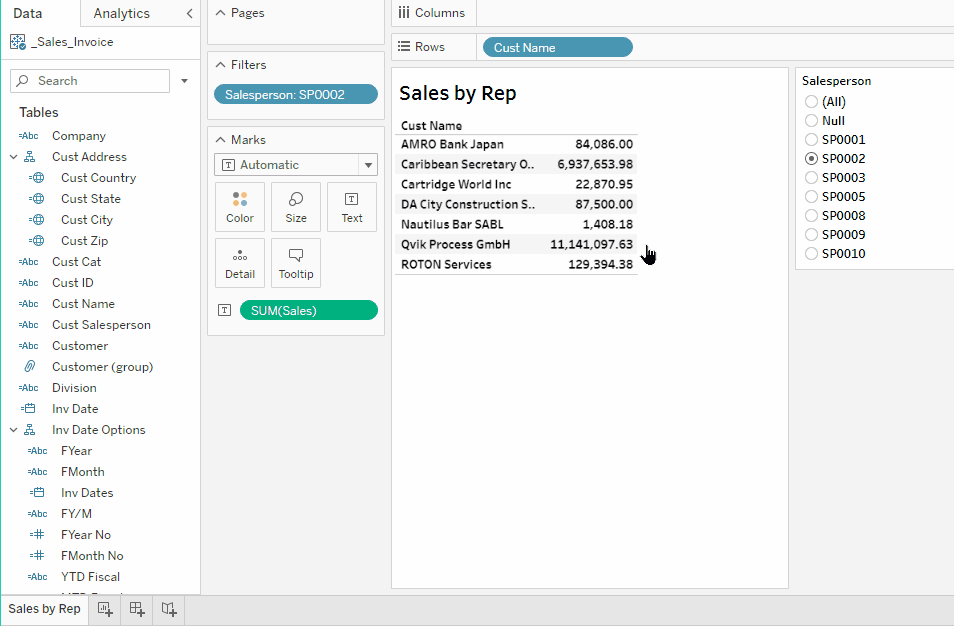 For this exercise, build a report showing Sales by Customer filtered by Salesperson, and add to the view title the Salesperson filter selection and the time when the data was updated: