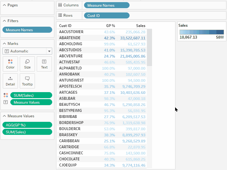 To see Subtotals per Cust Class, drag the Sales measure to the Label icon. This displays the total for each Cust Class. You might want to format the measure for a custom display.
