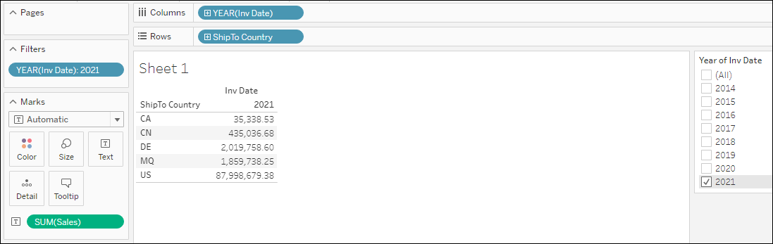 Activity 12: Create a sheet showing Sales by ShipTo per Inv Date Year column filtered for 2022.