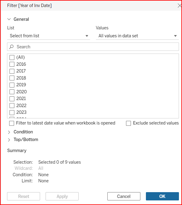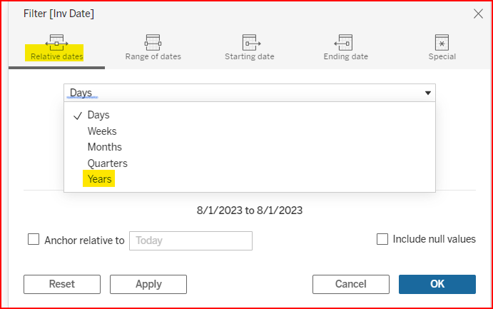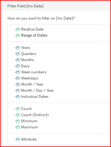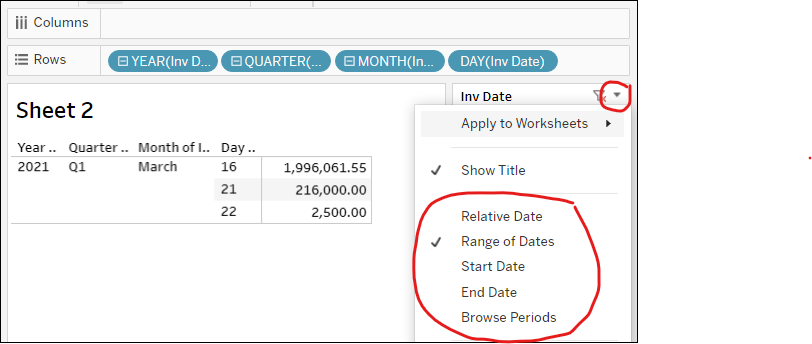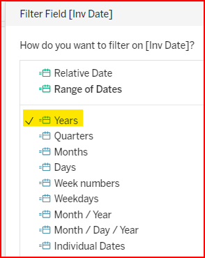 Drag and drop Inv Date into the Filters section. Note the different kinds of date filters available.
