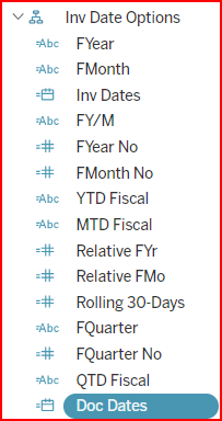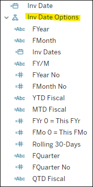 DataSelf adds special Inv Date Options fields to enhance reporting and filtering. See the screenshot below. Usually, these Date Option fields match with the company's fiscal period. Depending on your source system, these fields might come preconfigured to the calendar year or to the company's custom fiscal year. Consult DataSelf for details. Even though these fields are stored in a hierarchy, DataSelf used the hierarchy solely to group these custom fields together, not necessarily for a logical drilldown pattern.