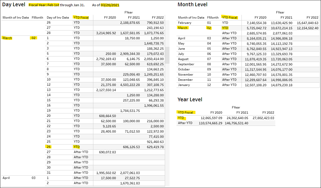 The following 3 examples consider a fiscal year starting on Feb the 1st and ‘today’ as 03/26/2021. Therefore, YTD Fiscal = YTD includes Feb 1 to Mar 26, and YTD Fiscal = After YTD covers Mar 27 to Jan 31.