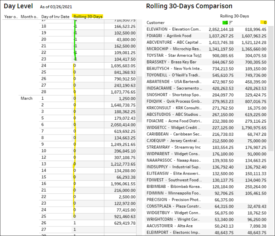 The report below shows the use-case for sales in the last 30-days (0 = Feb 24 to Mar 25) compared to the prior 30-day period (-1 = Jan 25 to Feb 23).