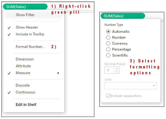 Formatting Labels: right-click the green sales measure in the Marks section → Format Number as desired. This formats how the Label value displays.