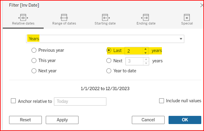 A common choice is selecting the Years time unit and Last 2 years as the relative timeline.