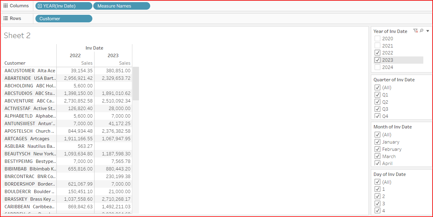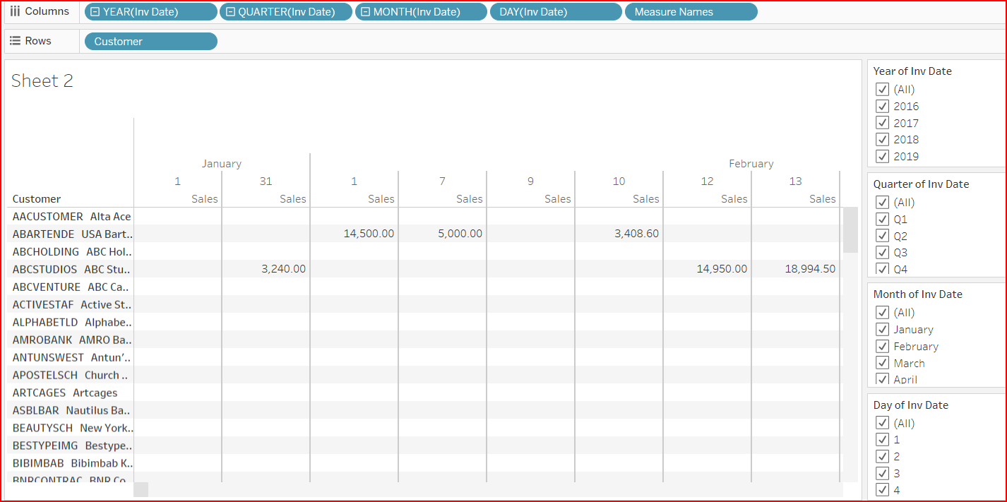 Optional Activity: Create view of Sales by Customer per Year. Show discrete filters for Year, Quarter, Month, Day