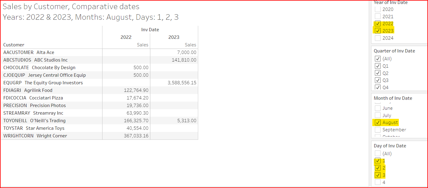 The example below shows Aug 1st - 3rd of 2022 & 2023. The Title was modified to show the Year, Month, and Day values selected.