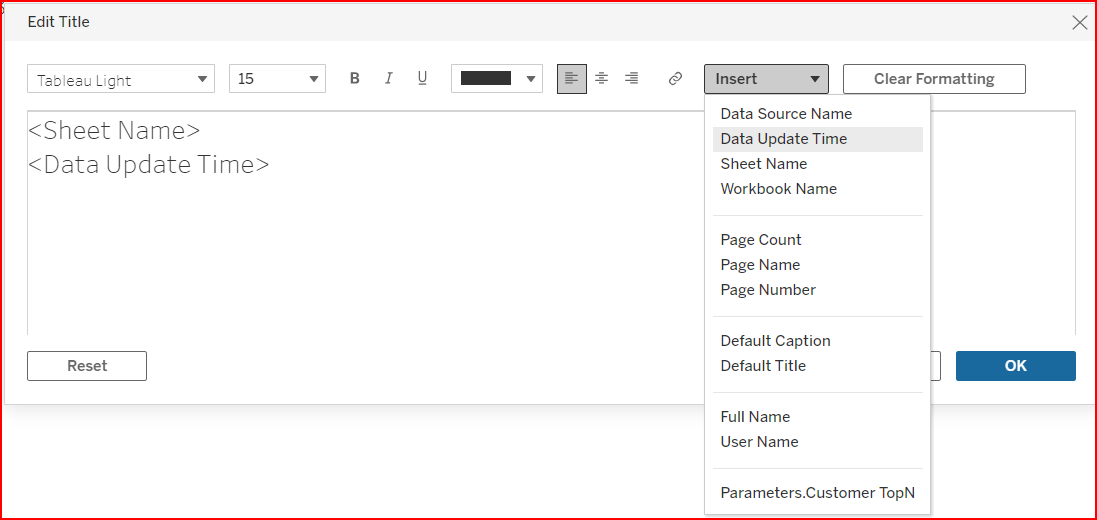On the title expression, go to the next line, type in “As of “, click Insert → Data Update Time → Ok.