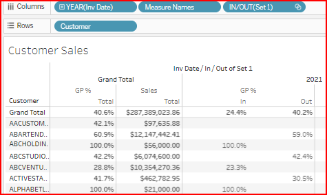 The Set dimension is a True/False calculation identifying records IN/OUT of the set.