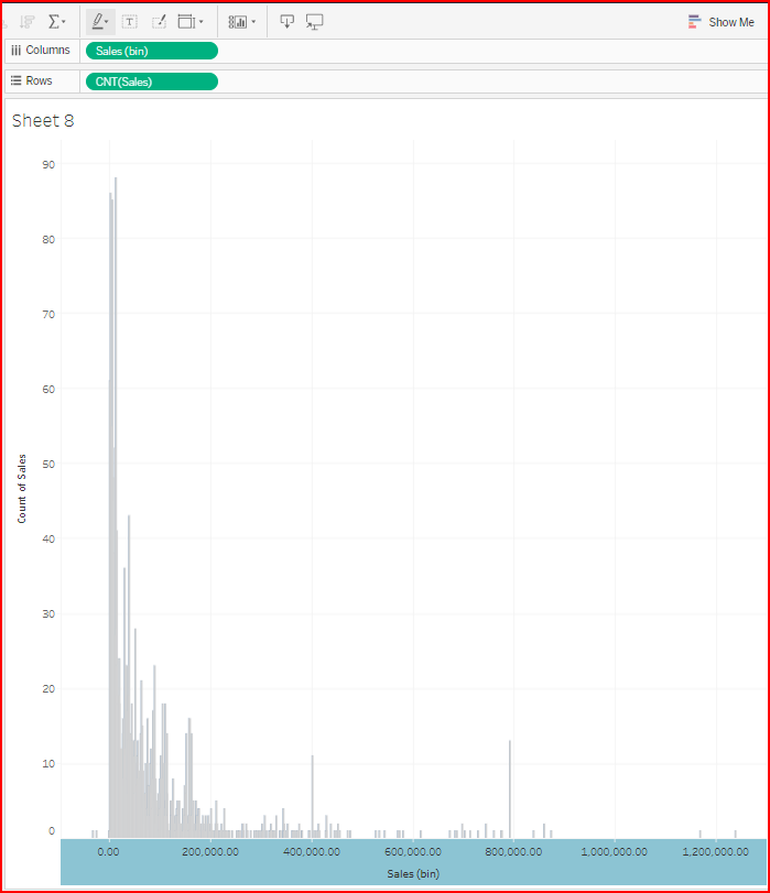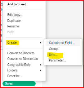 The most common way bins are used is in histograms to show line item sales in bin groupings. You can use the Show Me wizard for this. In the example below only the sales measure was highlighted when the Show Me wizard was selected. It suggested for one measure and automatically created a bin for that measure and a bar chart showing the transaction count of sales records per bin group.