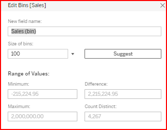 In the example below, the Sales measure was used to create a Sales Bin in groups of $100 increments.