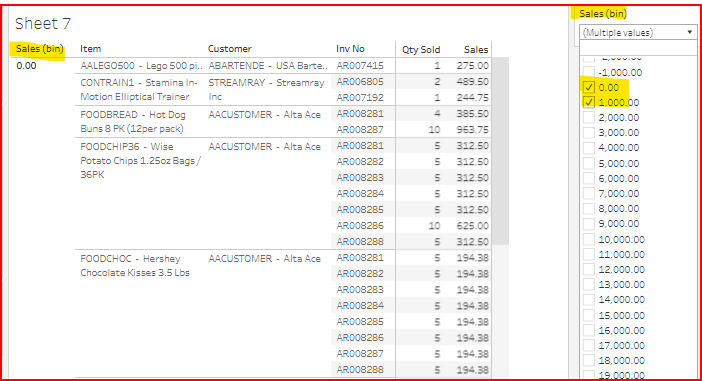 In the example below, the Sales (bin) dimension groups the transaction records into groups of 0 - 100 and 101 - 200. The filter for the Sales (bin) is shown and only the 0.00 & 1,000.00 values are selected.