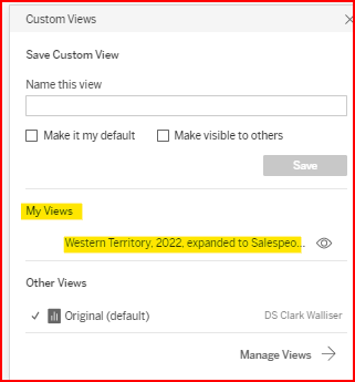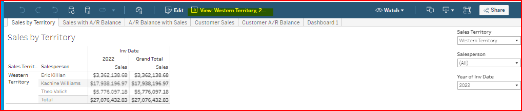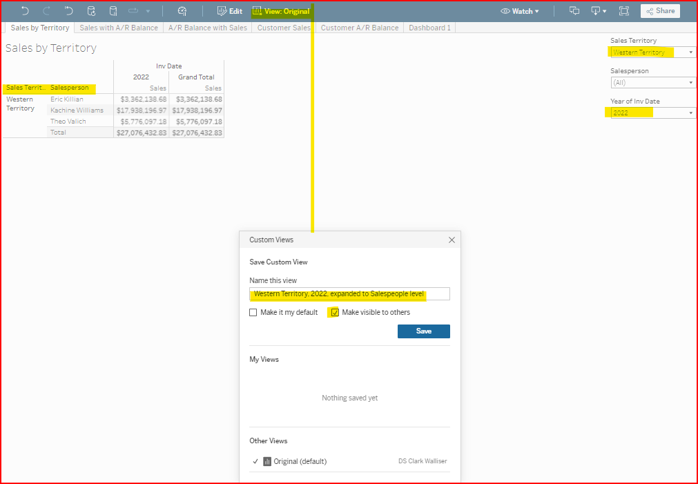 I want to set the filter for only 2022 sales for Western territory, and expand the hierarchy to show the sales people, and save that as a Custom View so any viewer can select it.
