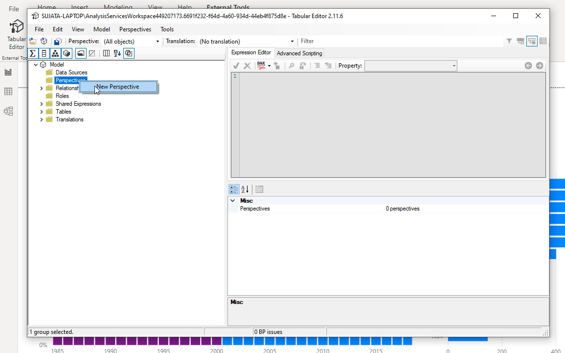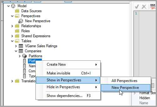 In Tabular Editor, right-click on the Perspectives folder to create a new perspective.