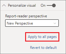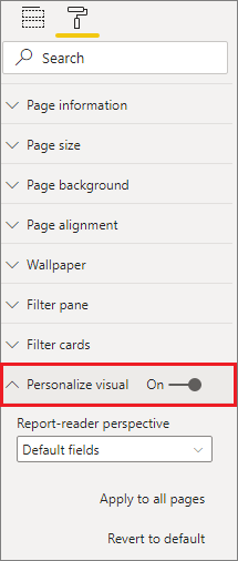Once you set the Perspective for the report page, the Personalize visuals experience for that page is filtered to the selected Perspective. Selecting Apply to all pages lets you apply your Perspective setting to all existing pages in your report.
