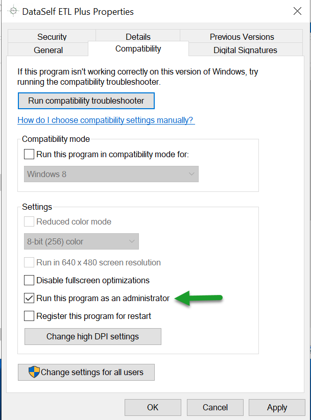 Check the box next to "Run this program as an administrator" under the "Settings" section.