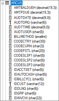 The following is an example of Sage 300 table and its column names, indexes, and formatting in ETL+. Ex.: AUDTORG and IDCUST are the primary keys of this table.