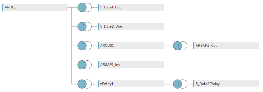 The following is an example of how Sage 300 _AR_Aging_Today tables are linked in DataSelf’s out-of-the-box templates. This linking applies the same way for Tableau data sources, Power BI data sets, Excel, and other reporting tools.