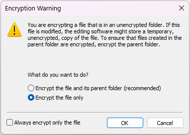 * Depending on the version of Windows, an Encryption Warning window may appear that gives the user an option of encrypting the file or the parent folder. Click the “Encrypt the file only” radio button.