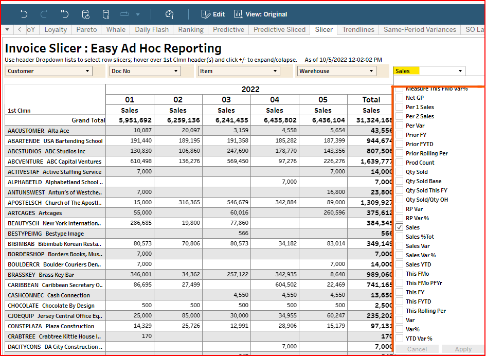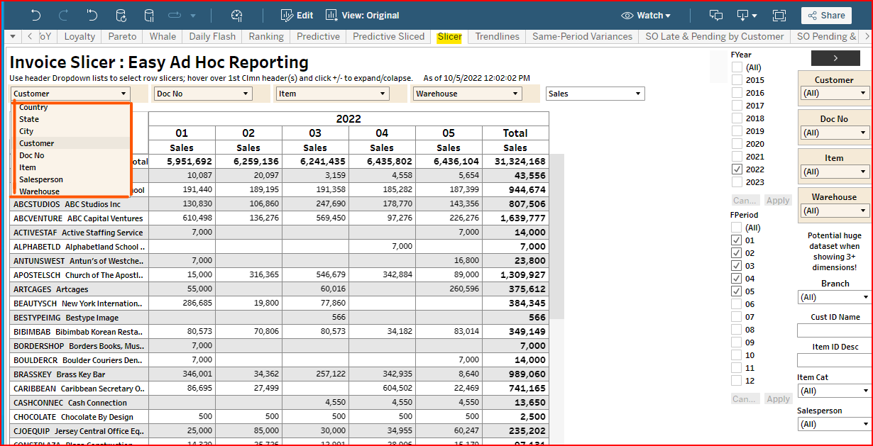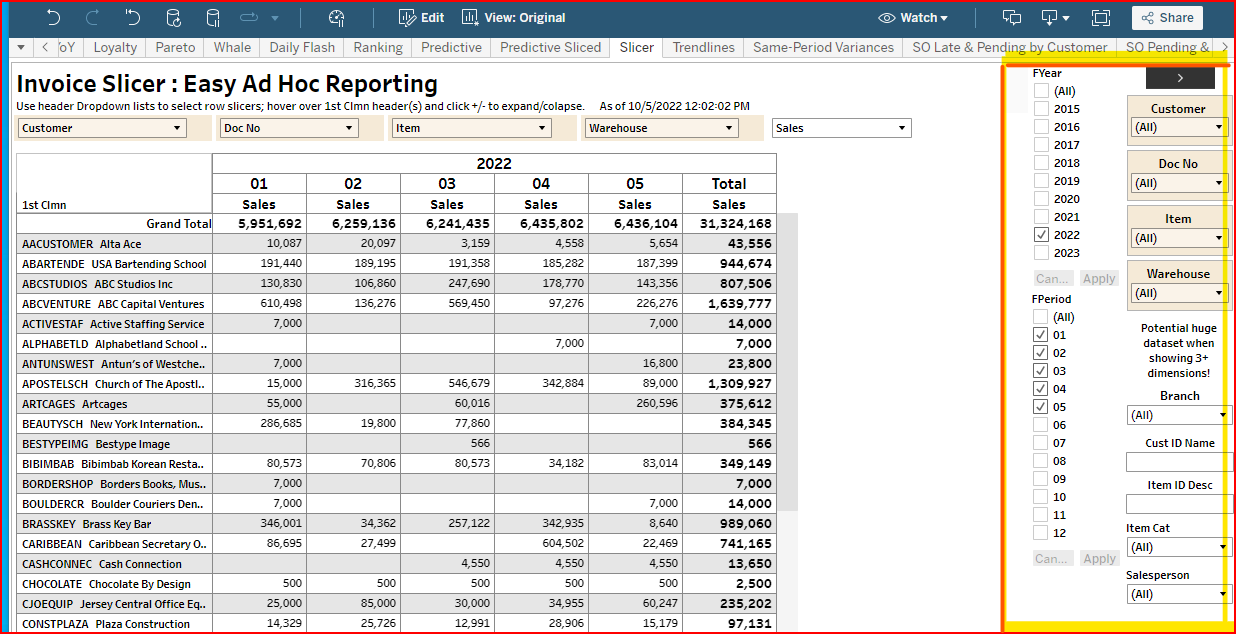 The Slicer worksheet is the most effective tool available to do ad-hoc queries without designing your own workbook.