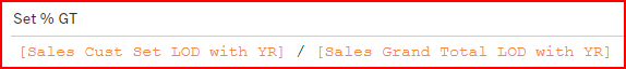 Create a regular calculated field to show sales per Customer Set / Sales Grand Total