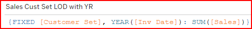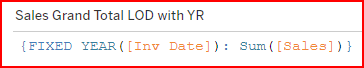 Note: an important characteristic of a Fixed LOD calculation is that it processes before dimension filters process. For example, if you use a filter to select only specific items, the LOD will still calculate based on the sales for all items. Converting a Dimension filter to a Context filter addresses this.