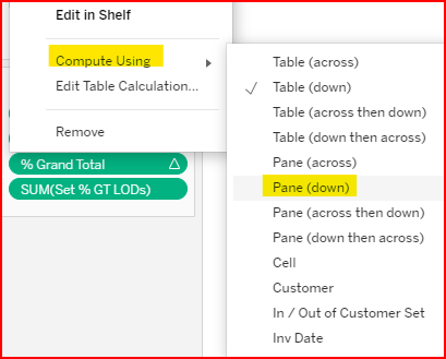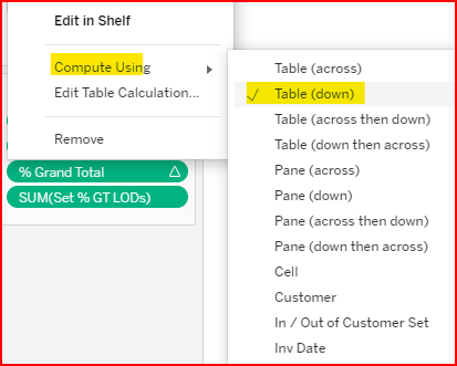 Convert the Sum (Sales) Measure Value to a Quick Table Calculation % of Set Total