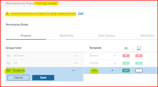In the screenshot below, the Group Students has been given permission to view all the contents of the training_orange project. The DataSelf standard is to store only data-sources in this project, which means members of the Student group can view all the data-sources.