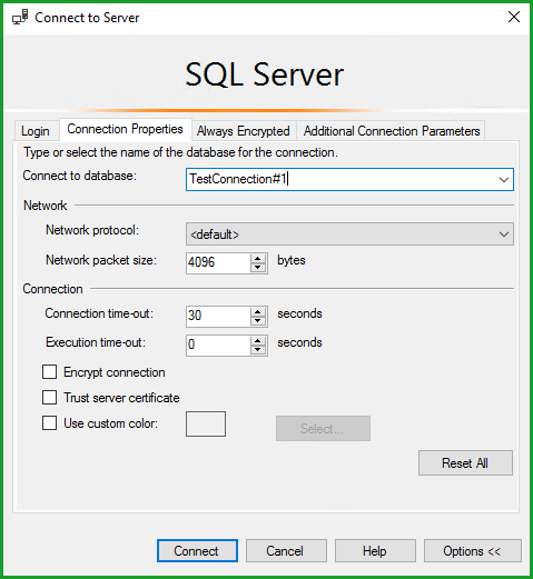 ![]() Enter Server name, select Authentication type, enter Login & Password. Finally click Options. | ![]() Enter |