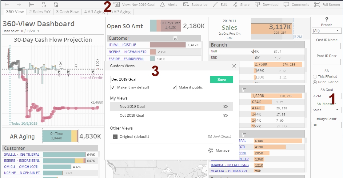 - Click the "View: Description" icon (# 2) and choose a previously saved goal under the "My Views" list (#3).