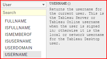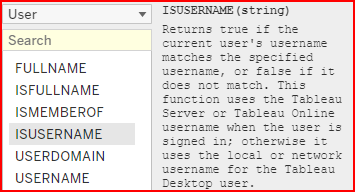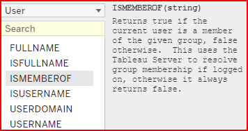 ![]() ISUSERNAME returns True if the logged in username matches the string value specified in the calculation | ![]() ISMEMBEROF returns True if the logged in username is a member of the Group name specified in the string value of the calculation | ![]() USERNAME returns the logged in username, which is different than the FULLNAME |