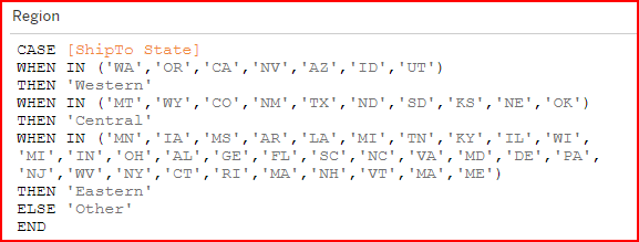 In your workbook, create a field identifying the Regions. This example is by Ship To State