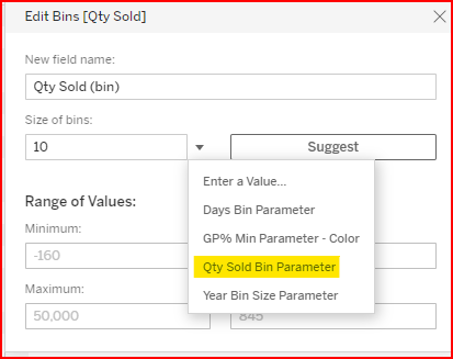 Qty Sold (bin)and set the Size of bins to theQty Sold Bin Parameter