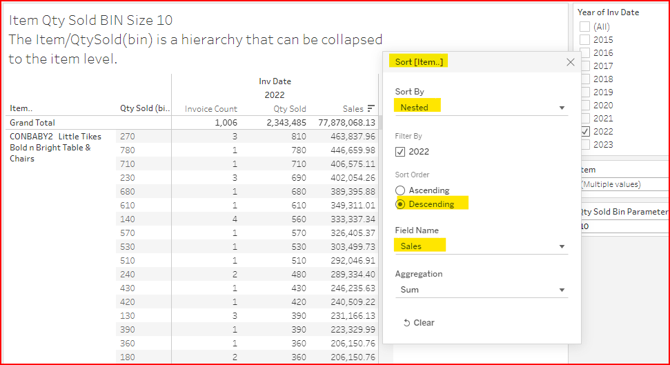 7. Sort the rows in Descending order based on the Nested Sales value. This shows the highest sales item as first on the list. Then when the hierarchy is expanded to show the Qty Sold (bin) field, the highest selling bin qty shows first