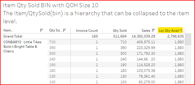 6. (Optional) Create a hierarchy for Item / Qty Sold (bin) enabling you to collapse to the Item level and expand to the Qty Sold (bin) level