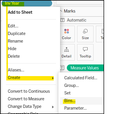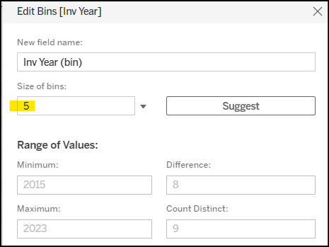 Enter the Bin Size to group years. In this example the Invoice Year is being grouped (binned) in 5-year multiples