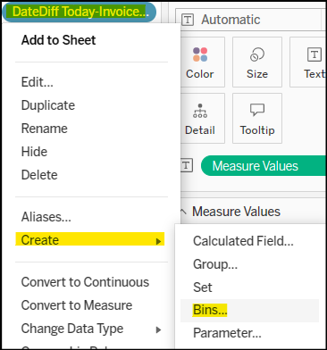 DateMin&DateMaxfields show the date rang of each binTo see the difference in the sales amount between bin groups, create a table calculation for % Difference from previous row as shown in the example above.
